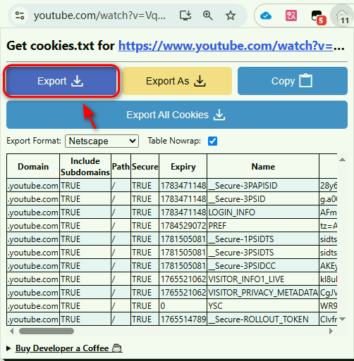 选择Export,会下载一个txt文档,www.youtube.com_cookies.txt,把这个文件的所在路径写在前面提到的yt-dlp_macos中的-- cookies参数后面即可。