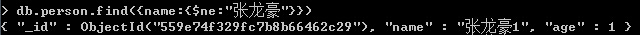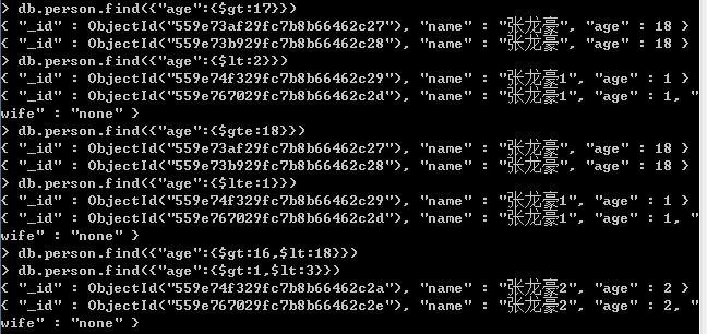 3、{"age":{$gt:1}} : person集合中年龄大于1的所有数据文档